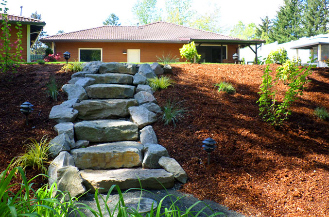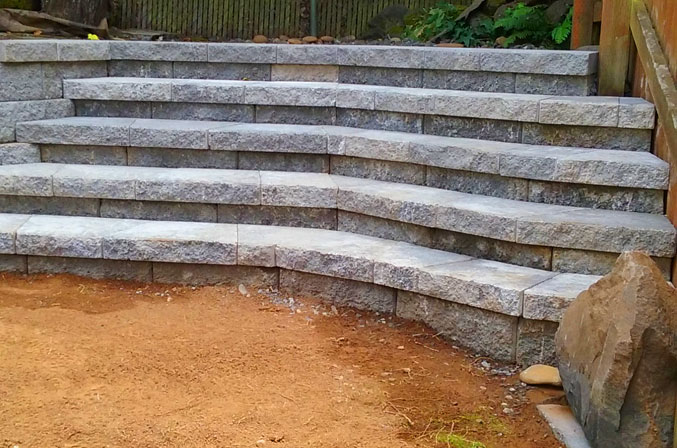 Whether going up or down a steep incline having a quality set of stairs makes it a lot safer and easier. Royal Green Landscaping can offer you a custom set of stairs to fit your landscape needs. We offer a variety of natural rock stairways, or, if a more formal look is what you desire, decorative engineered block is another elegant choice. With several different types of materials available, we are sure to find the one that will work for you. All stairs are built to the highest standards and will withstand the test of time.
